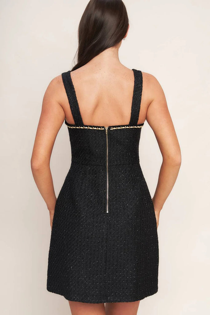 Indulge in timeless elegance with our Black Tweed Dress. Crafted from luxurious tweed, this classic dress features a tasteful button-down design and delicate straps, perfect for any sophisticated occasion. Elevate your style with this exclusive piece and make a statement with every step.