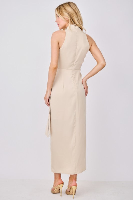 • Crafted from a luxurious blend of 97% polyester and 3% spandex, this sleeveless maxi dress features a chic mock neck and flattering slit detail that adds movement and sophistication.