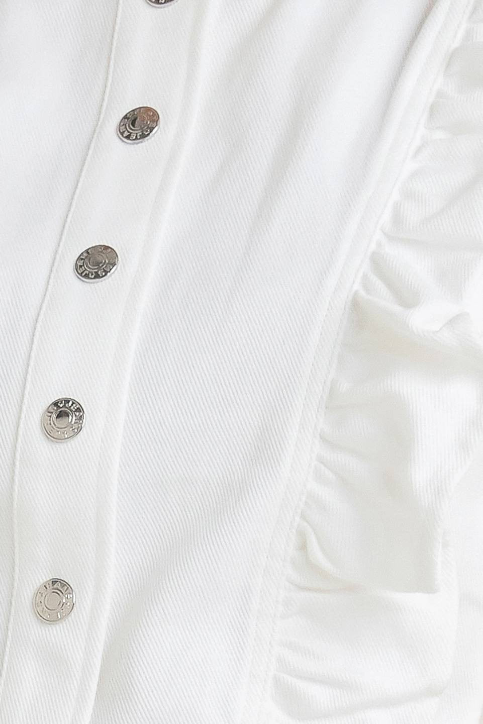 "Take your style to the next level with our Sugar Ruffle Top! This twill top boasts a round neckline with a daring ruffle detail, perfect for adding a touch of boldness to any outfit. Elevate your look and stand out from the crowd with this unique and chic top!"