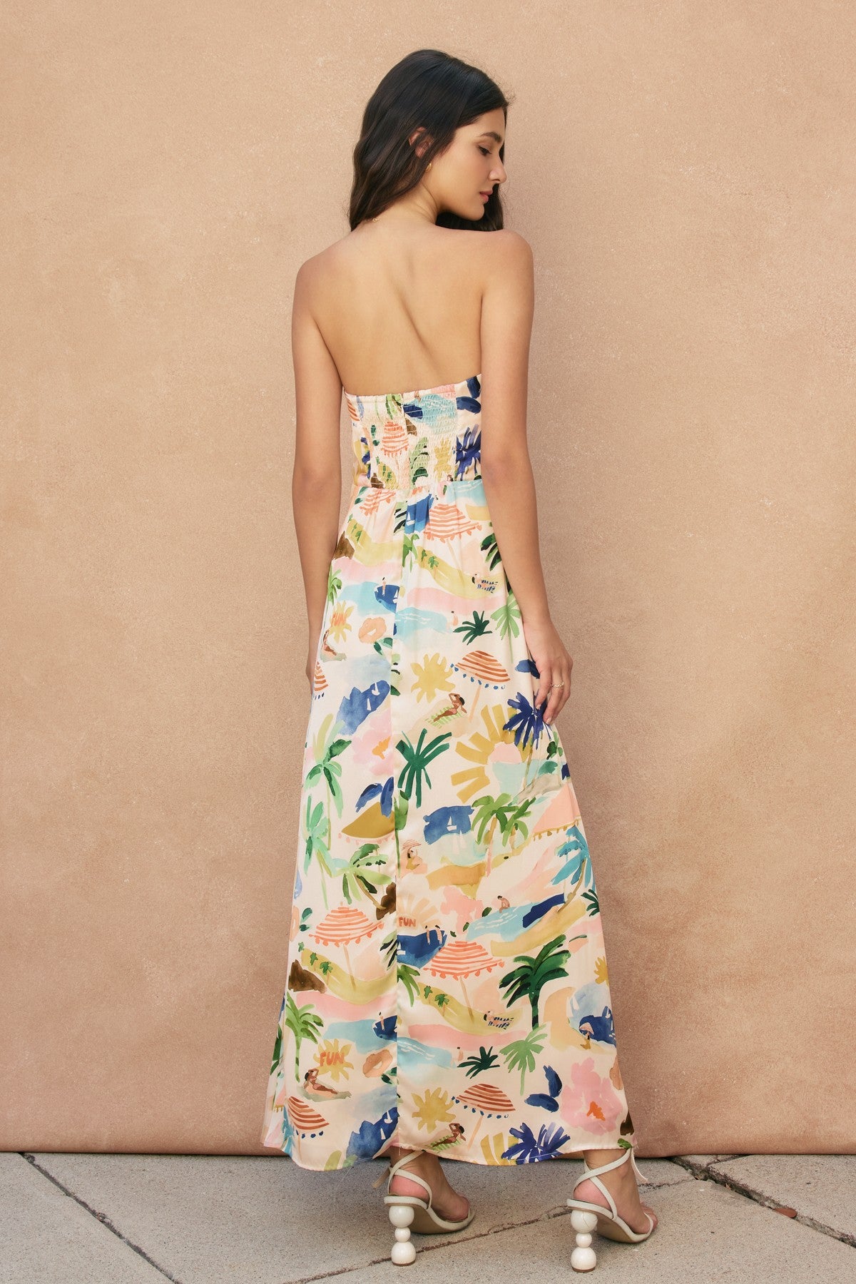 The Isla Bonita strapless maxi dress features a watercolored print that enhances visual appeal. Designed with a straight neck and gel gripper to provide stability and support, it ensures comfort during wear. The hidden back zipper facilitates easy dressing, while the tube top design complements various body types.
